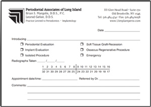 Thank you for choosing Periodontal Associates of Long Island. We recognize that an optimum outcome for our patients often calls for close collaboration with the referring dentist. This is particularly important with implant cases and we find it essential to work with your restorative ends in mind.